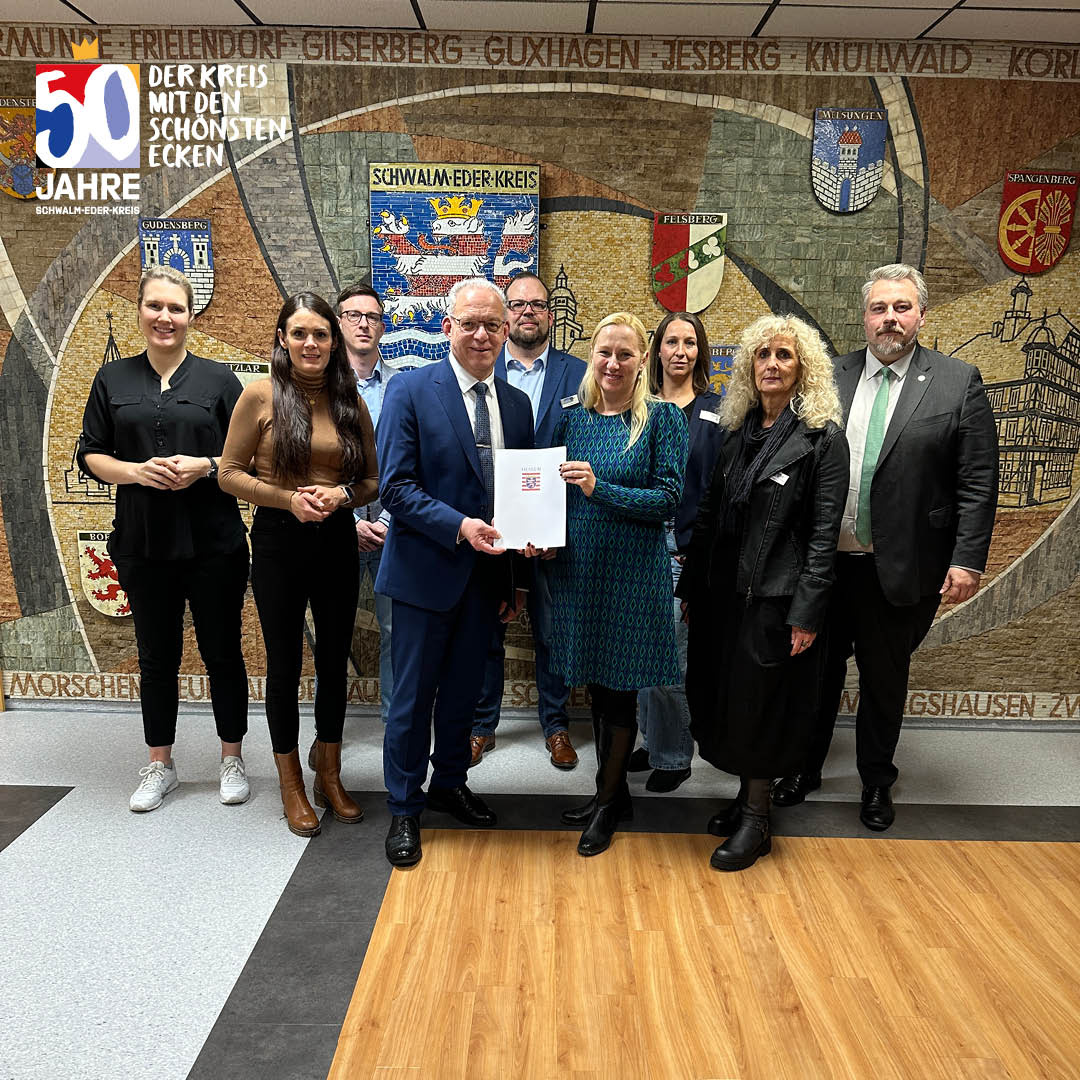 Pressebild zur Pressemeldung Pflegestützpunkte entwickeln sich weiter zu Pflegekompetenzzentren Wiesbaden/Schwalm-Eder-Kreis. Einen Förderbescheid in Höhe von 150.000 Euro für den Pflegestützpunkt Schwalm-Eder überreichte Familien- und Gesundheitsministerin Diana Stolz heute im Kreishaus in Homberg (Efze) an den Ersten Kreisbeigeordneten Jürgen Kaufmann. Dabei betonte sie, wie wichtig es dem Land Hessen ist, diese „zuverlässigen Anlaufstellen“ für Pflegende, Angehörige und pflegebedürftige Menschen zu unterstützen.