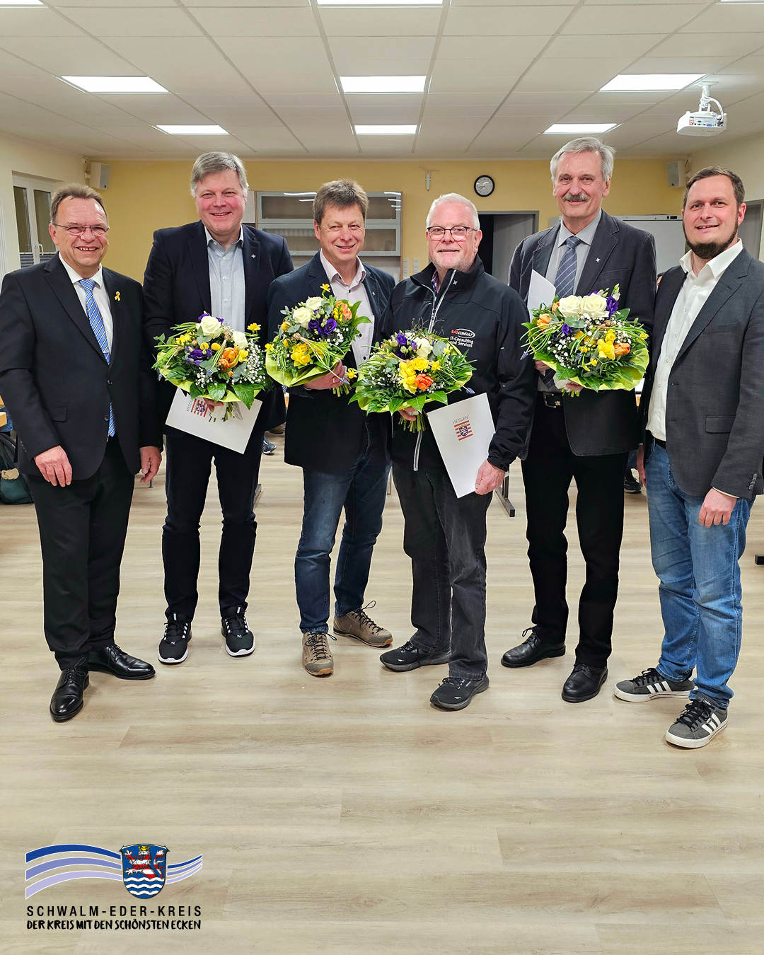 v.l.: Landrat Winfried Becker, Michael Wolf, Bernd Kling, Martin Gombert, Bernd Aubel, Bürgermeister Heiko Manz Im Rahmen der Gemeindevertretersitzung zeichnete Landrat Winfried Becker langjährige Mandatsträger der Gemeinde Jesberg mit dem Ehrenbrief des Landes Hessen aus.