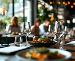 Ein modern eingerichtetes Restaurant mit elegant gedeckten Tischen. Im Vordergrund ist ein Teller mit einem angerichteten Gericht unscharf zu sehen. Im Hintergrund sitzen mehrere Personen in gemütlicher Atmosphäre zusammen und essen oder unterhalten sich. Warmes Licht und grüne Pflanzen schaffen ein einladendes Ambiente.