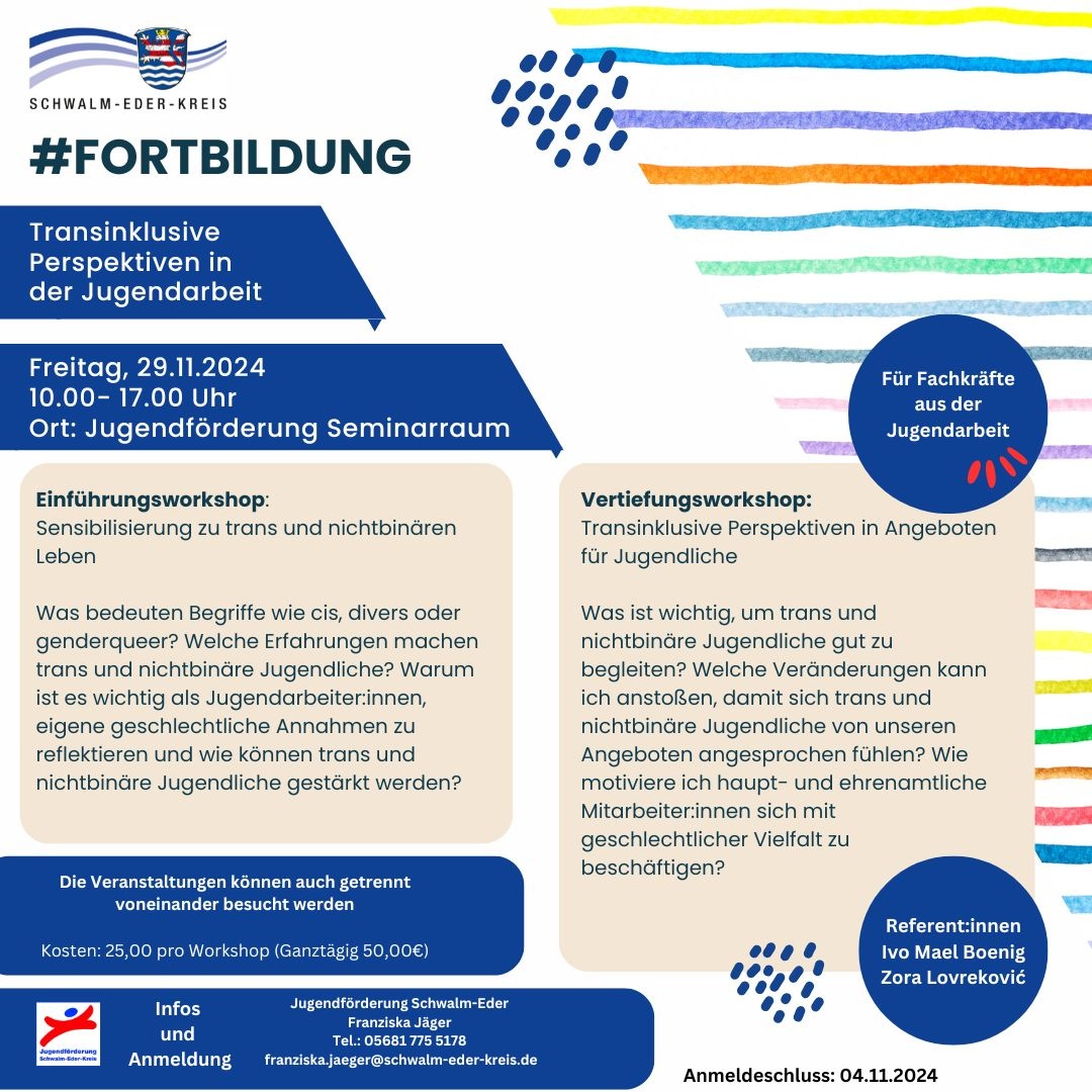 Der Workshop richtet sich an alle haupt- und ehrenamtlichen Mitarbeiter*innen aus der Jugendarbeit, die ihre Arbeitsweisen und Angebote transinklusiver gestalten möchten. Vorwissen zu geschlechtlicher Vielfalt, trans und nichtbinärem Leben wird vorausgesetzt. Eine Einführung zu geschlechtlicher Vielfalt sowie trans und nichtbinären Leben wird es vormittags in dem Einführungs-Workshop geben.
