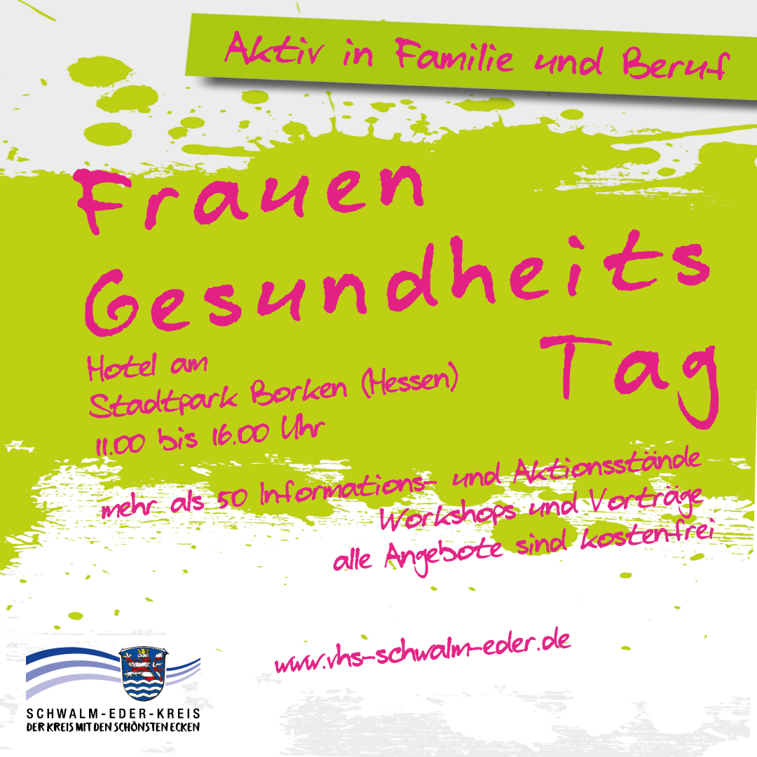 Plakat mit grün-weißem Farbhintergrund und pinkfarbener Handschrift. Oben auf einem grünen Balken steht: „Aktiv in Familie und Beruf“. Darunter in großer Schrift: „Frauen Gesundheits Tag“. Weitere Informationen: „Hotel am Stadtpark Borken (Hessen), 11.00 bis 16.00 Uhr“. Zusätzlich: „Mehr als 50 Informations- und Aktionsstände, Workshops und Vorträge – alle Angebote sind kostenfrei“. Unten das Logo des Schwalm-Eder-Kreises mit dem Slogan „Der Kreis mit den schönsten Ecken“ sowie die Internetadresse „www.vhs-schwalm-eder.de“.