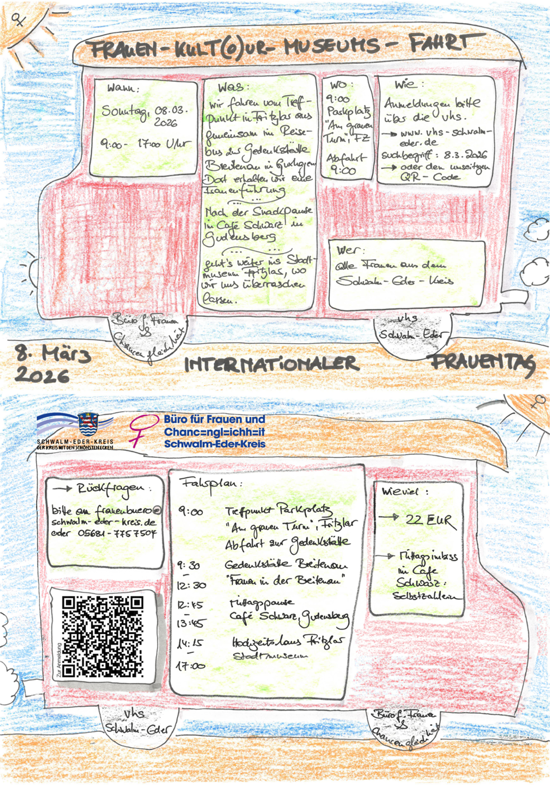 Anlässlich des Internationalen Frauentags am 8. März 2026 lädt das Büro für Frauen und Chancengleichheit des Schwalm-Eder-Kreises gemeinsam mit der vhs Schwalm-Eder zur Frauen-Kult(o)ur-Museumsfahrt ein. Von 9:00 bis 17:00 Uhr geht es im Reisebus zur Gedenkstätte Breitenau in Guxhagen – dort findet eine Führung zum Thema „Frauen in der Breitenau“ statt. Anschließend folgt eine Mittagspause im Café Schwarz in Gudensberg (Selbstzahlerinnen), bevor das Stadtmuseum Hofgeismar besucht wird. Teilnehmen können alle Frauen aus dem Schwalm-Eder-Kreis. Die Teilnahmegebühr beträgt 22 Euro. Anmeldungen sind bis zum 8. März über die vhs Schwalm-Eder möglich: www.vhs-schwalm-eder.de Nach dem großen Erfolg der ersten Auflage unserer Frauenkult(o)urfahrt in die Schwalm im Jahr 2020, nehmen wir uns jetzt den Nordteil unseres Landkreises vor: