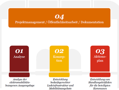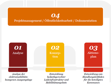 Abbildung der vier aufbauenden Bausteine der Studie Das Elektromobilitätskonzept wurde auf vier Bausteinen aufgebaut. Zunächst wurden durch die Analyse der elektromobilitätsbezogenen Ausgangslage die Rahmenbedingungen betrachtet. Dazu wurden u.a. neben den aktuellen Technologien im Bereich der Elektroautos insbesondere der aktuelle Stand der Ladeinfrastruktursysteme sowie die vielfältigen Rechtsvorschriften die mit der Elektromobilität einhergehen beschrieben. Da bei der Entwicklung von attraktiven Elektromobilitätskonzepten die spezifischen Besonderheiten des Planungsgebiets zu berücksichtigen sind, galt es, die verkehrs- und raumplanerischen sowie infrastrukturellen Rahmenbedingungen Nordhessens ebenfalls zu berücksichtigen. In die Analyse wurden neben der sozioökonomischen und funktionsräumlichen Struktur sowie den mobilitätsseitigen Merkmalen auch die bereits existierenden Elektromobilitätskonzepte einbezogen. Eine Abfrage auf Landes- und Kreisebene zu den aktuellen Aktivitäten im Bereich neuartiger (Elektro-)Mobilitätskonzepte hat ergeben, dass sich 74 Projekte in Planung bzw. Umsetzung befinden.
