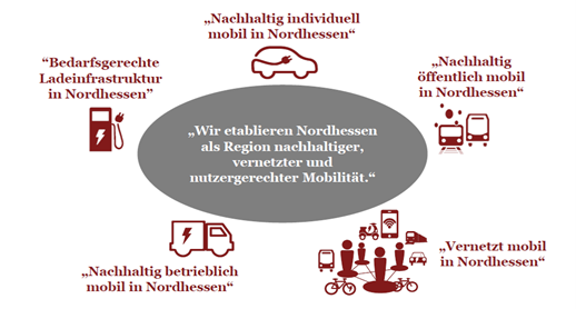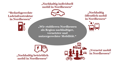 Abbildung der fünf Themenschwerkunkte Auf Basis der umfangreichen Voruntersuchung der Region Nordhessen konnten die regionalen Handlungsbedarfe im Hinblick auf den Ausbau und die Stärkung der Elektromobilität in Nordhessen abgeleitet werden. Die fünf regionalen Handlungsbedarfe/Themenschwerpunkte sind rechts auf der Grafik abgebildet.