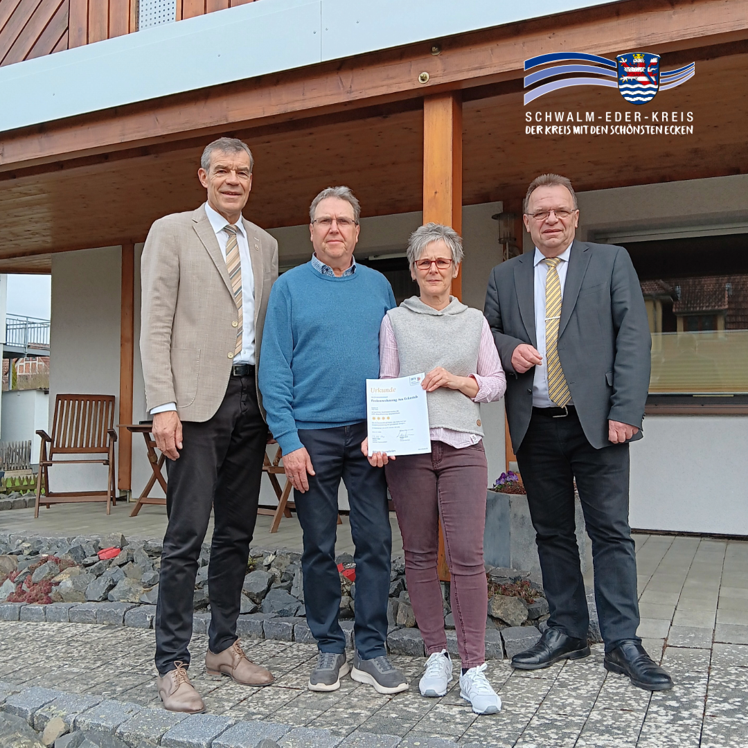 Von drei auf vier Sterne – dieses Qualitäts-Upgrade gab es kürzlich für die Ferienwohnung „Am Eckerich“ in Fritzlar. Die offizielle Klassifizierungsurkunde zum 4-Sterne-Siegel des Deutschen Tourismusverbandes (DTV) überreichten Landrat Winfried Becker, Bürgermeister Hartmut Spogat und Susanne Ebel vom Stadtmarketing Fritzlar der Gastgeberfamilie Sandra und Klemens Konrad.