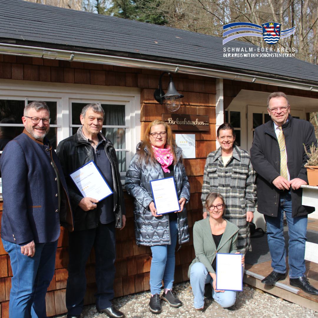 Die drei Urkunden wurden von Landrat Winfried Becker, der Fachbereichsleiterin der Wirtschaftsförderung, Tatjana Grau-Becker, Bürgermeister Frank Grunewald sowie Martina Junghans, Stadt Niedenstein persönlich überbracht. Die kleine Feierstunde fand direkt auf dem idyllisch gelegenen Campingplatz Weißenthalsmühle statt und unterstreicht den besonderen Charakter des Ortes.