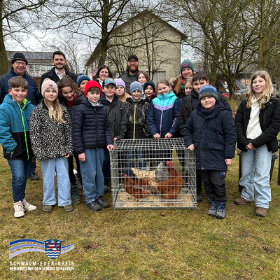 Foto zur Pressemeldung "Vier tierische Klassenkameraden" Abschluss des Projekts Kinder-Landrat des Schwalm-Eder-Kreises: Vierte Klasse an der Hochlandschule Gilserberg hat für drei Monate Miethühner