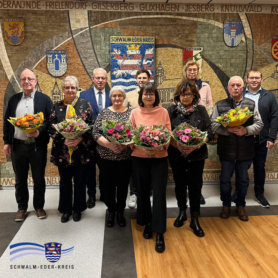 Vize-Landrat Kaufmann bedankte sich bei Gundula Gemmecker, Rosemarie Rausch, Eva-Maria Felix, Amalia Lening, Heribert Hetzel, Johann Waldt, Bernd Schäfer, Heidrun Trieschmann, Walter Hansmann, Monika Grönke und Joachim Orth für ihre geleistete Arbeit in der Kreisverwaltung.