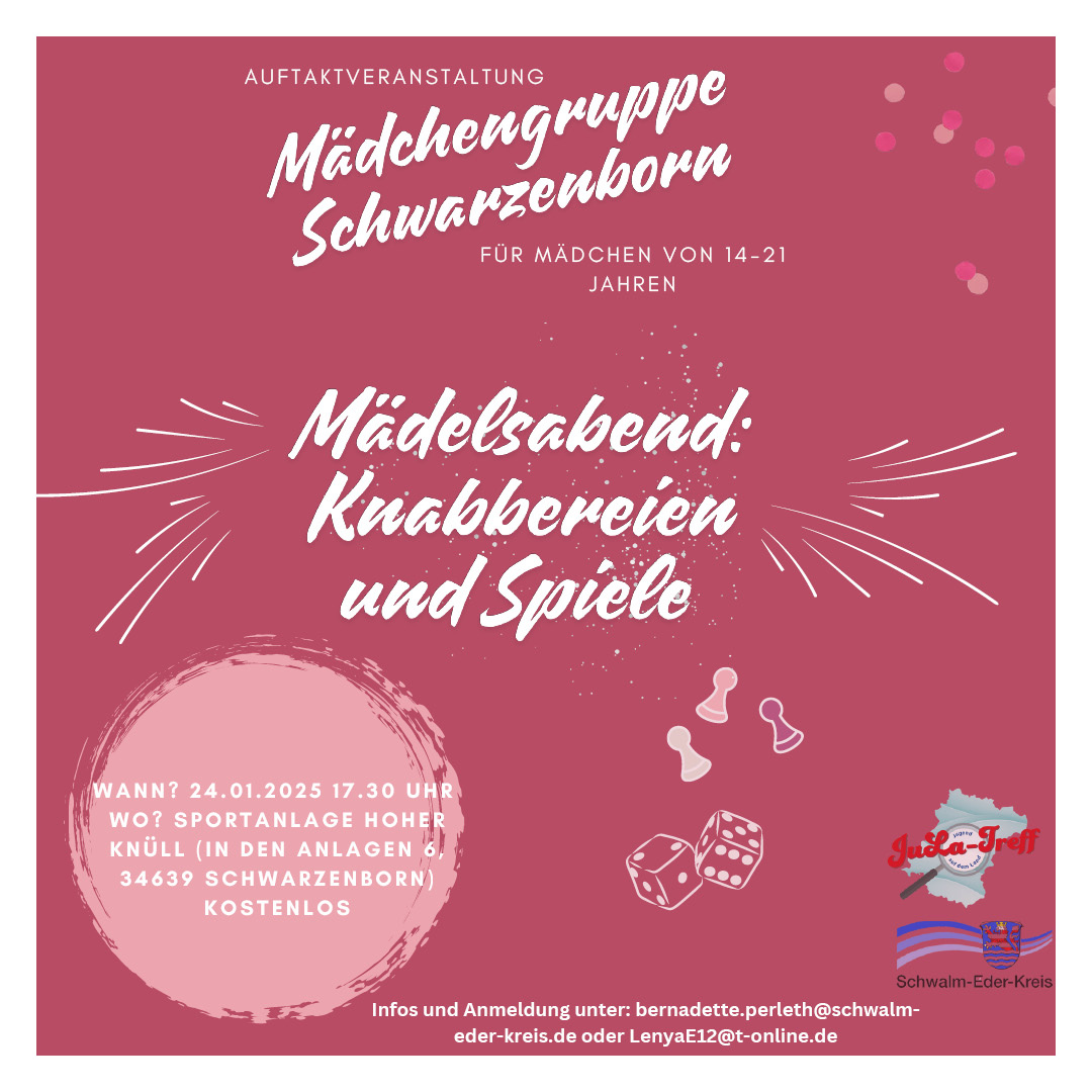 Die Jugendarbeit in Schwarzenborn erhält einen frischen Impuls: Ab Januar 2025 wird eine neue Mädchengruppe ins Leben gerufen, die Mädchen im Alter von 14 bis 21 Jahren die Möglichkeit bietet, sich in einem geschützten Rahmen auszutauschen, zu lernen und gemeinsam aktiv zu sein. Das erste Treffen findet unter dem Motto „Mädelsabend: Knabbereien und Spiele“ am 24. Januar um 17.30 Uhr in der Sportanlage Hoher Knüll in Schwarzenborn, In den Anlagen 6, statt.