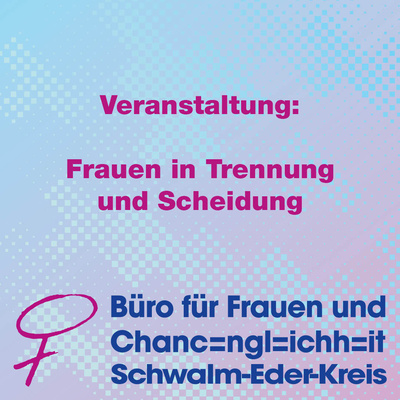 Kalenderbild Frauen in Trennung und Scheidung - Veranstaltung Das Büro für Frauen und Chancengleichheit des Schwalm-Eder-Kreises bietet am Montag, den 2. Dezember 2024 von 18:00 bis 20:00 Uhr einen kostenfreien Online-Workshop für Frauen zum Thema „Trennung und Scheidung“ an.