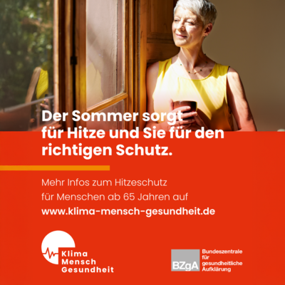Tipps für Menschen ab 65 Jahren, der Hitze zu begegnen, gibt es auf der Internetseite "Klima - Mensch - Gesundheit" des Bundesinstituts für Öffentliche Gesundheit unter folgendem Link: https://www.klima-mensch-gesundheit.de/hitzeschutz/menschen-ab-65-und-angehoerige/