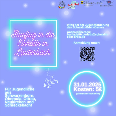 Ab aufs Eis! – heißt es am 31. Januar. Im Rahmen ihres Projekts „Aufsuchende Jugendarbeit in ländlichen Räumen“ bietet die Jugendförderung einen Ausflug in die Eishalle nach Lauterbach (Vogelsbergkreis) an. Teilnehmen können Jugendliche im Alter von 14 bis 21 Jahren aus Oberaula, Ottrau, Schwarzenborn, Neukirchen und Schrecksbach.